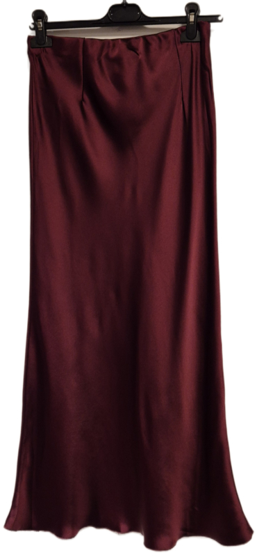 Soepelvallende, satijnen rok met elastische boord. De A-lijn rok is ongevoerd en aan de onderzijde met een locksteek afgewerkt. De glanzende stof geeft de rok een chique look. Uiteraard is de rok mooi te combineren met een bijvoorbeeld een witte blouse. Lengte ca. 100 cm. One size, draagbaar tot ca. maat 40.