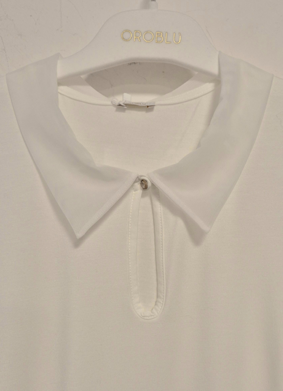 T-shirt van het merk Oroblu met tule kraag en lange mouw, uitgevoerd in micromodal/katoen voor een perfect draagcomfort. Afgewerkt met klein glinsterknoopje om het shirt te sluiten. Wasbaar op 30 graden. In diverse maten en kleuren.
