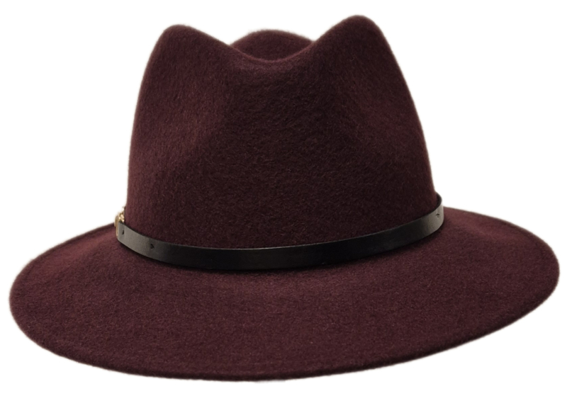 Vlotte dameshoed van wolvilt van het merk Andrea. Deze 'fedora' heeft een ring in bol en twee deuken aan de voorzijde. De hoed is strak gegarneerd met een leren riempje en een goudkleurige gesp. Leverbaar in diverse kleuren en maten.