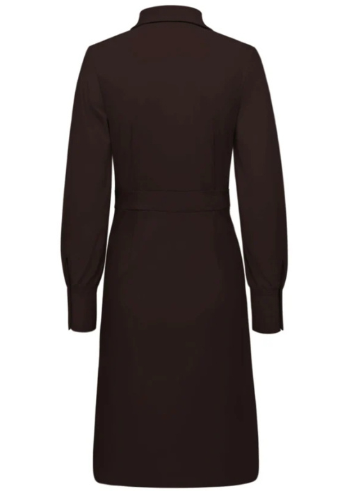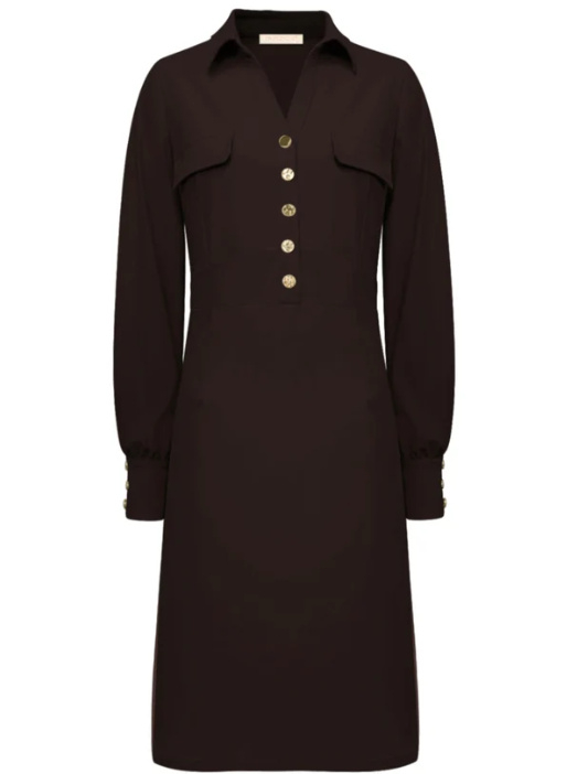 Een prachtige getailleerde jurk van Triple Nine met lange mouwen. Deze korte jurk heeft een kraag en sluiting met decoratieve goudkleurige knopen. Dit item van top kwaliteit travelstof valt op de knie, gemiddelde lengte ca. 102 cm. Leverbaar in diverse kleuren en maten (valt goed op maat, S=36). Kortom, een prachtige basisjurk!!