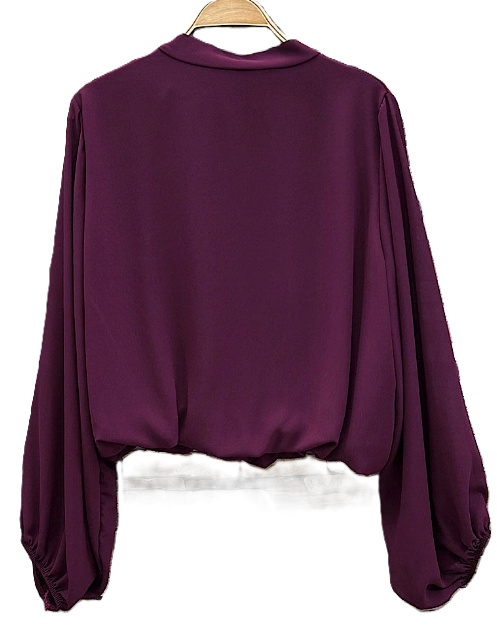 Vlotte damesblouse/top van dunne gladde stof met een viscose voering. Deze blouse heeft een opstaand boordje en een strik linksvoor. Zowel de mouwen als het boordje onderaan zijn met elastiek afgezet, waardoor de top mooi valt op een rok of broek. One size, zeker draagbaar tot en met confectiemaat 42. Leverbaar in diverse kleuren.