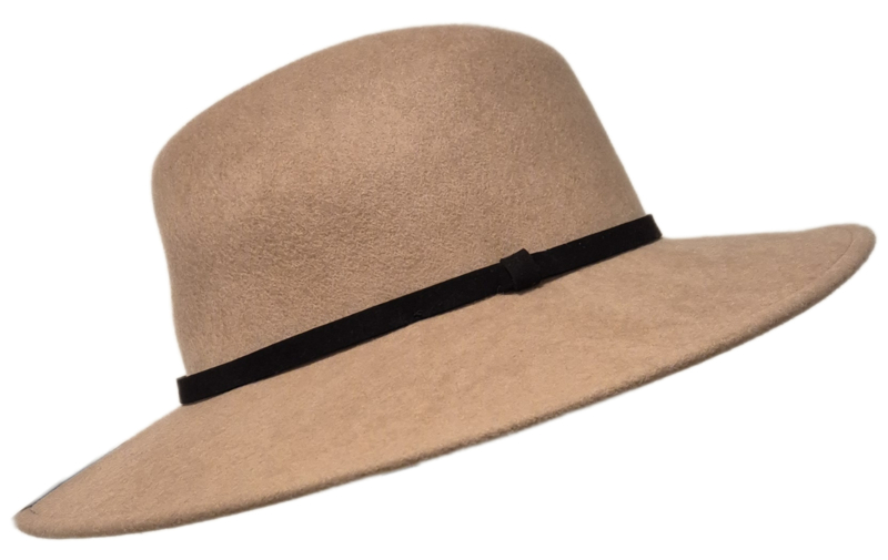 Vlotte dameshoed van Hatland. De hoed heeft een variatie in de bol en een aflopende rand rondom. Deze hoed is afgewerkt met een smalle zwarte band en lusgarnering aan de rechterkant. Doorsnee ca. 32 cm., rand ca. 8 cm en hoogte middenvoor ca. 10 cm. Hoofdmaat ca.58/59.