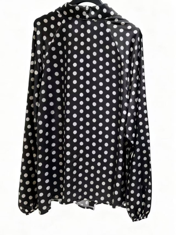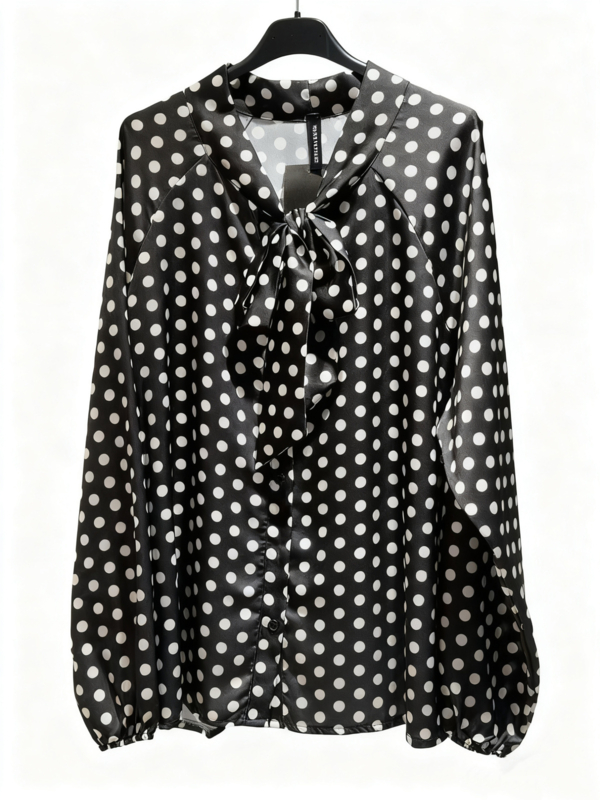 Prachtige damesblouse van soepele satijnstof. Deze blouse heeft een allover stippenpatroon. De blouse heeft een knoopsluiting en opstaand kraagje met strik aan de voorzijde. De prachtige glans en striksluiting zorgen voor een feestelijke, chique look. Leverbaar in diverse kleuren.