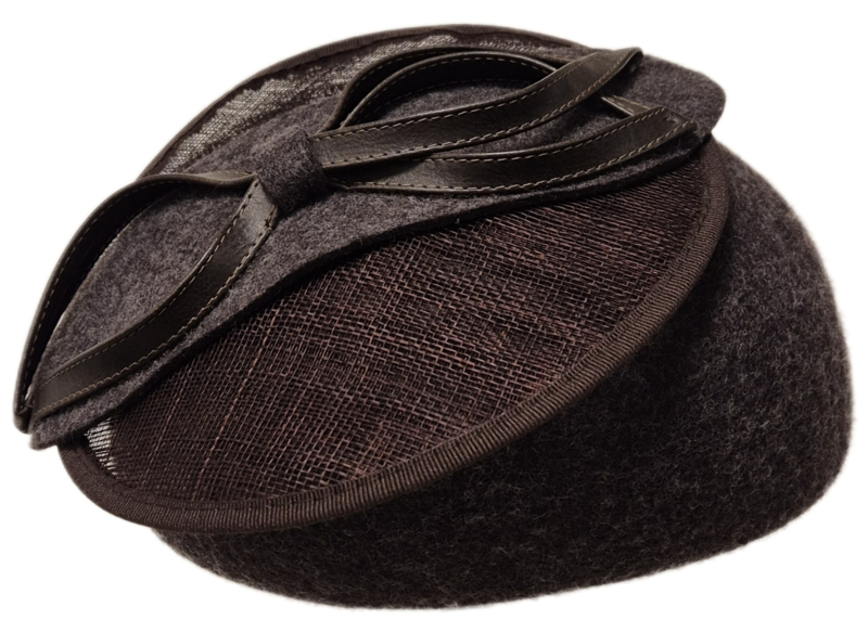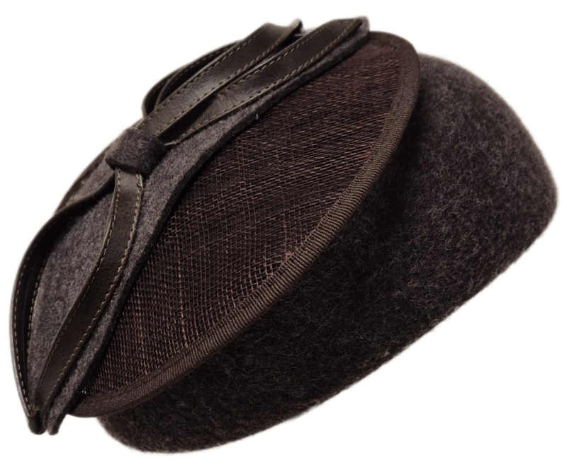 Mooie ovale dophoed van het merk Complit in wolvilt. Dit model is afgewerkt met een mooie garnering van sinamay in combinatie met een lus van vilt en leer, die goed over de dop valt waardoor dit model wat royaler lijkt. Deze dophoed heeft een prettige pasvorm en blijft goed zitten door de beugel. Doorsnee ca. 21 cm. Zeer geschikt voor de kerk of een (feestelijke) gelegenheid. Verkrijgbaar in diverse kleuren.