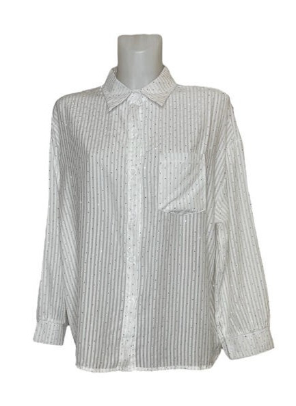 Prachtige damesblouse van soepele, dunne stof. Deze blouse heeft een fijn verticaal streeppatroon en is versierd met kleine glinsterende strass-steentjes voor een subtiele, vrouwelijke touch. De blouse heeft een puntkraag, kleine manchetten en één borstzakje. Dit rechte model valt mooi soepel en royaal. Combineer deze blouse met een (beige) jeansrok voor een casual look of draag 'm op een nette rok of pantalon voor een chique uitstraling.