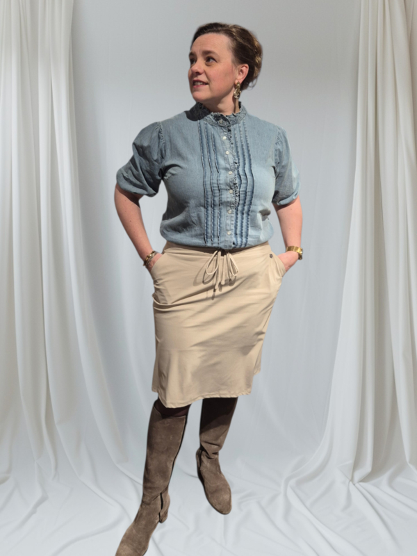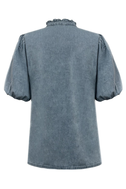Prachtige damesblouse van het merk Triple Nine. Deze blouse van soepele denimstof draagt heel luchtig en comfortabel. De blouse heeft een opstaand boordje met een klein roeselrandje. Het voorpand heeft het verschillende siernaadjes en sluit door middel van parelmoerkleurige drukknopen. De blouse heeft korte mouwen met elastiek in de boord, wat zorgt voor een subtiel pofeffect. Deze veelzijdige blouse is zowel sportief als casual-chic te dragen. Leverbaar in diverse maten (valt goed op maat).
