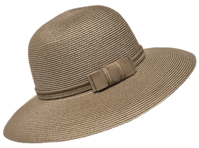 Vlotte dameshoed met ronde bol en soepelvallende rand (ongeapretteerd). Om de bol een bijpassende ripslint met strik aan de rechterzijde. Hoogte bol ca. 10 cm., doorsnee ca. 34 cm. Hoofdmaat ca. 57 cm. In meerdere kleuren leverbaar.