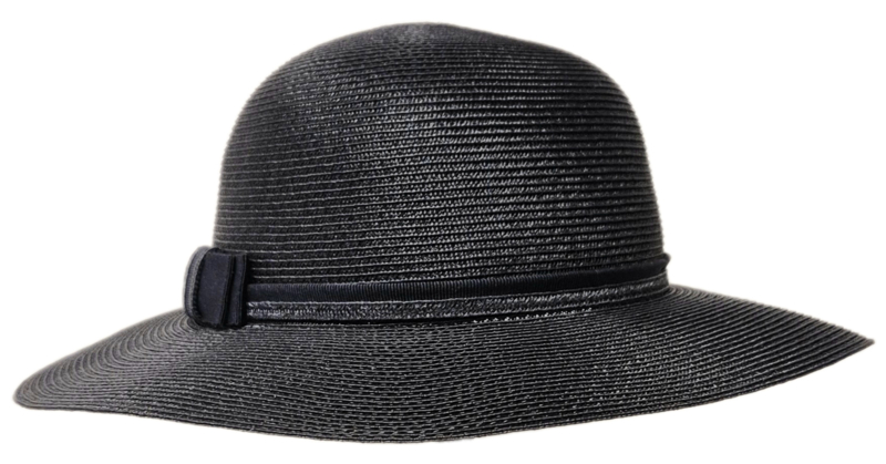 Vlotte dameshoed met ronde bol en soepelvallende rand (ongeapretteerd). Om de bol een bijpassende ripslint met strik aan de rechterzijde. Hoogte bol ca. 10 cm., doorsnee ca. 34 cm. Hoofdmaat ca. 57 cm. In meerdere kleuren leverbaar.