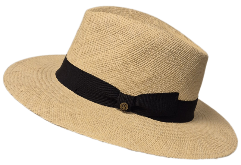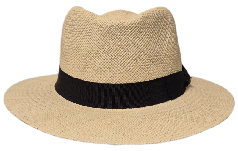 Prachtige, handgemaakte Panamahoed van origineel toquilla stro. Deze traveller heeft een iets aflopende rand en is gegarneerd met een luxe, zwarte ripsband en heeft aan de linkerzij de een soort strik. De stoffen binnenband zorgt voor nog meer draagcomfort, waardoor de hoed heerlijk verkoelend is tijdens warme dagen. Dit model is geschikt voor zowel dames als heren. Doorsnee ca. 30,5 cm., hoogte middenvoor ca. 9,5 cm., rand middenachter ca. 7 cm. Leverbaar in diverse hoofdmaten.