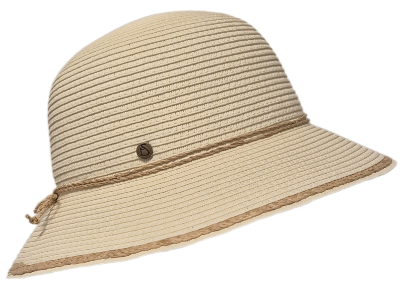 Deze zomerse dameshoed is gemaakt van luchtig, crushable papierstro. De hoed heeft een ronde bol en een aflopende rand. De hoed is gegarneerd met een raffia koordje, deze kleur komt ook terug in de rand. Doorsnee ca. 30 cm., hoogte middenvoor ca. 10 cm., rand rondom ca. 7,5 cm. Hoofdmaat M/57. Leverbaar in diverse kleuren.