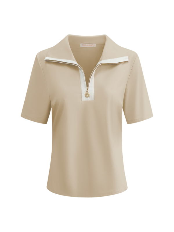Prachtig shirt met uit de nieuwe collectie van Triple Nine. Deze top heeft een luxe schipperskraag met een rits. De kraag is afgezet met een bies in contrastkleur (offwhite) en de goudkleurige rits heeft een sierlijk bloemhangertje als detail. Het shirt heeft korte mouwen en een rechte snit. Perfect te combineren met de bijpassende rokken van Triple Nine. De top valt goed op maat S = 36.