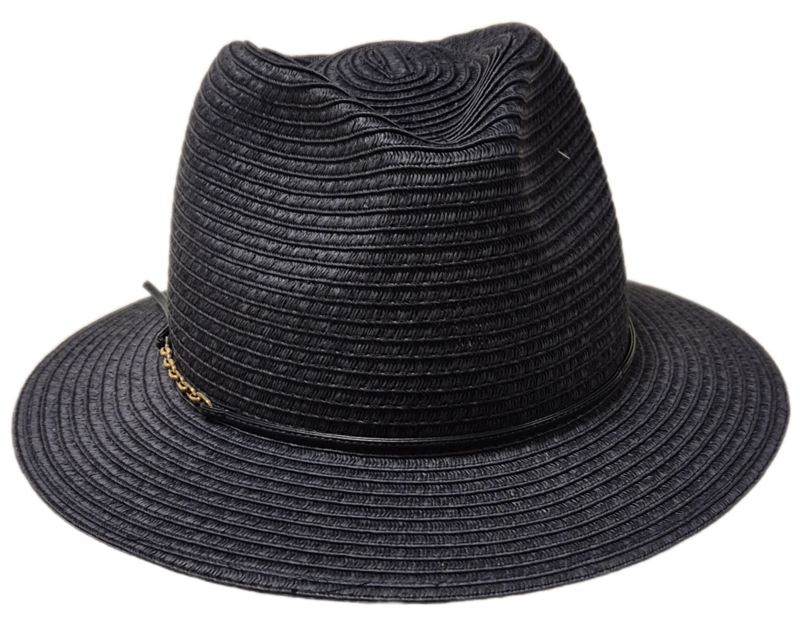 Mooie dameshoed van soepel naaistro. De hoed heeft een ring in de bol en een flexibele rand. Dit vlotte model is mooi gegarneerd met een smal leren bandje en goudkleurige schakelgarnering aan de rechter zijkant. Doorsnee ca. 29 cm., hoogte middenvoor ca. 9 cm., rand ca. 6 cm. Leverbaar in diverse kleuren en hoofdmaten.
