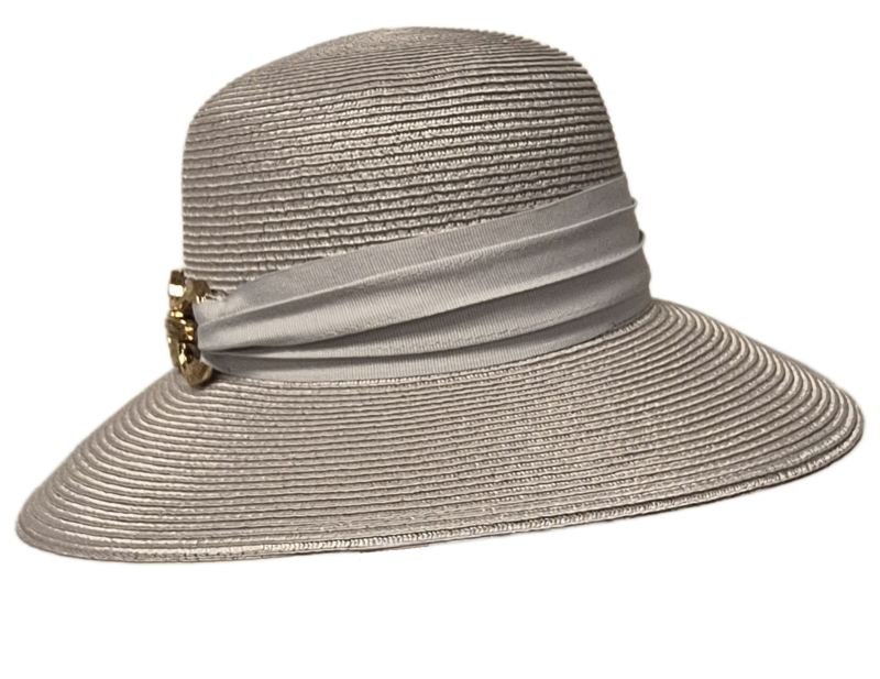 Vlotte dameshoed van het Italiaanse merk Complit. Deze hoed heeft een ronde bol en een aflopende rand. Deze hoed is gegarneerd met geplooid ripsband en een sierlijke goudkleurige gesp aan de rechter zijkant. Doorsnee ca. 34 cm., hoogte middenvoor ca. 9,5 cm., rand rondom ca. 8,5 cm. In meerdere kleuren leverbaar.