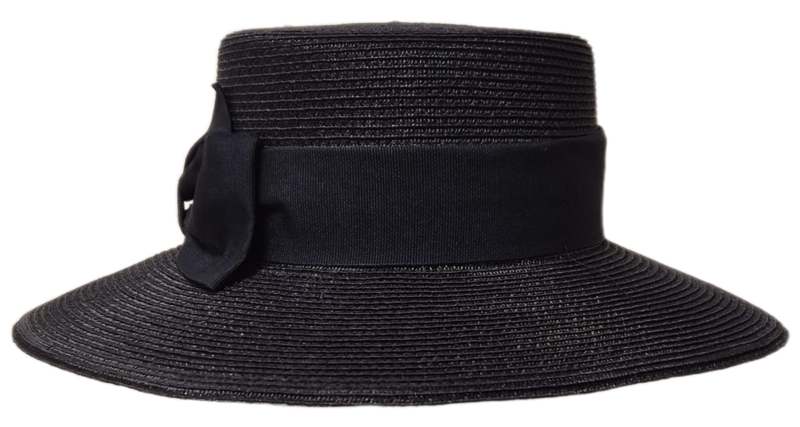 Vlotte dameshoed van het Italiaanse merk Complit. Deze hoed heeft een vlakke bol en een rechte rand (matelot). Deze hoed is gegarneerd met ripsband en heeft een strik aan de rechter zijkant. Doorsnee ca. 33 cm., hoogte middenvoor ca. 8,5 cm., rand rondom ca. 8 cm. In meerdere kleuren leverbaar.
