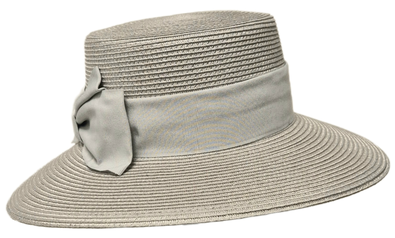 Vlotte dameshoed van het Italiaanse merk Complit. Deze hoed heeft een vlakke bol en een rechte rand (matelot). Deze hoed is gegarneerd met ripsband en heeft een strik aan de rechter zijkant. Doorsnee ca. 33 cm., hoogte middenvoor ca. 8,5 cm., rand rondom ca. 8 cm. In meerdere kleuren leverbaar.