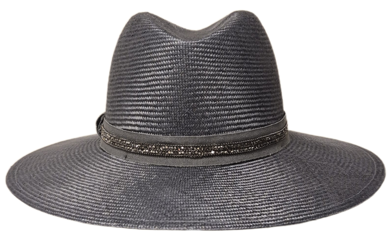 Grote, vlotte dameshoed met een aflopende rand rondom. De bol is in de lengte wat uitgehold. De hoed is gegarneerd met ripsband in combinatie met strass en heeft een lusje met logo aan de rechter zijkant. Doorsnee ca. 35 cm., hoogte bol middenvoor ca. 10 cm., rand middenachter ca. 9 cm. Hoofdmaat M/57.