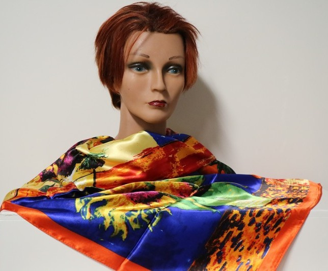 Dé trend van dit seizoen: deze prachtige shawl met schilderachtige print. Deze vierkante shawl van glansstof heeft een oranje rand en een zonnig gekleurd tafereel. Afmeting: ca. 90 x 90 cm. Leverbaar in verschillende prints.
