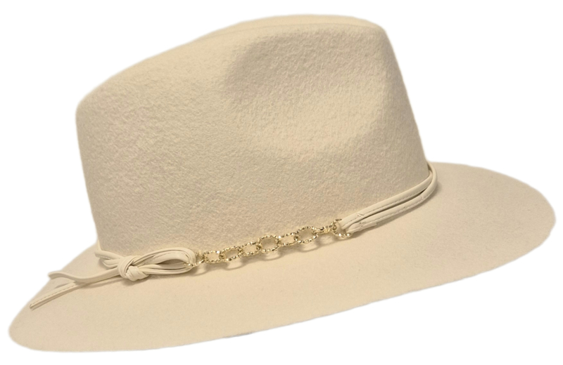 Trendy breedgerande dameshoed in uni kleur. Deze royale fedora heeft een rechte rand en is gegarneerd met bijpassend ripsband en goudkleurige schakels, wat zorgt voor een luxe detail en elegante look. Doorsnee…€ 39,95 - Dameshoed Venus art. 2449 - offwhite