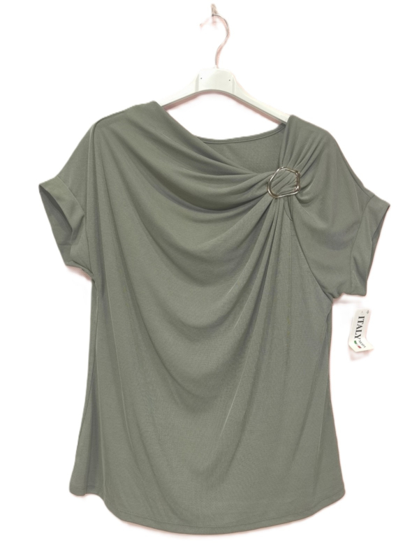 Mooie top met korte kapmouw. Dit shirt heeft een a-symmetrische draperiehals in combinatie met een goudkleurige gesp, wat zorgt voor een elegante look. De zeer soepele kwaliteit (voornamelijk viscose) zorgt…€ 39,95