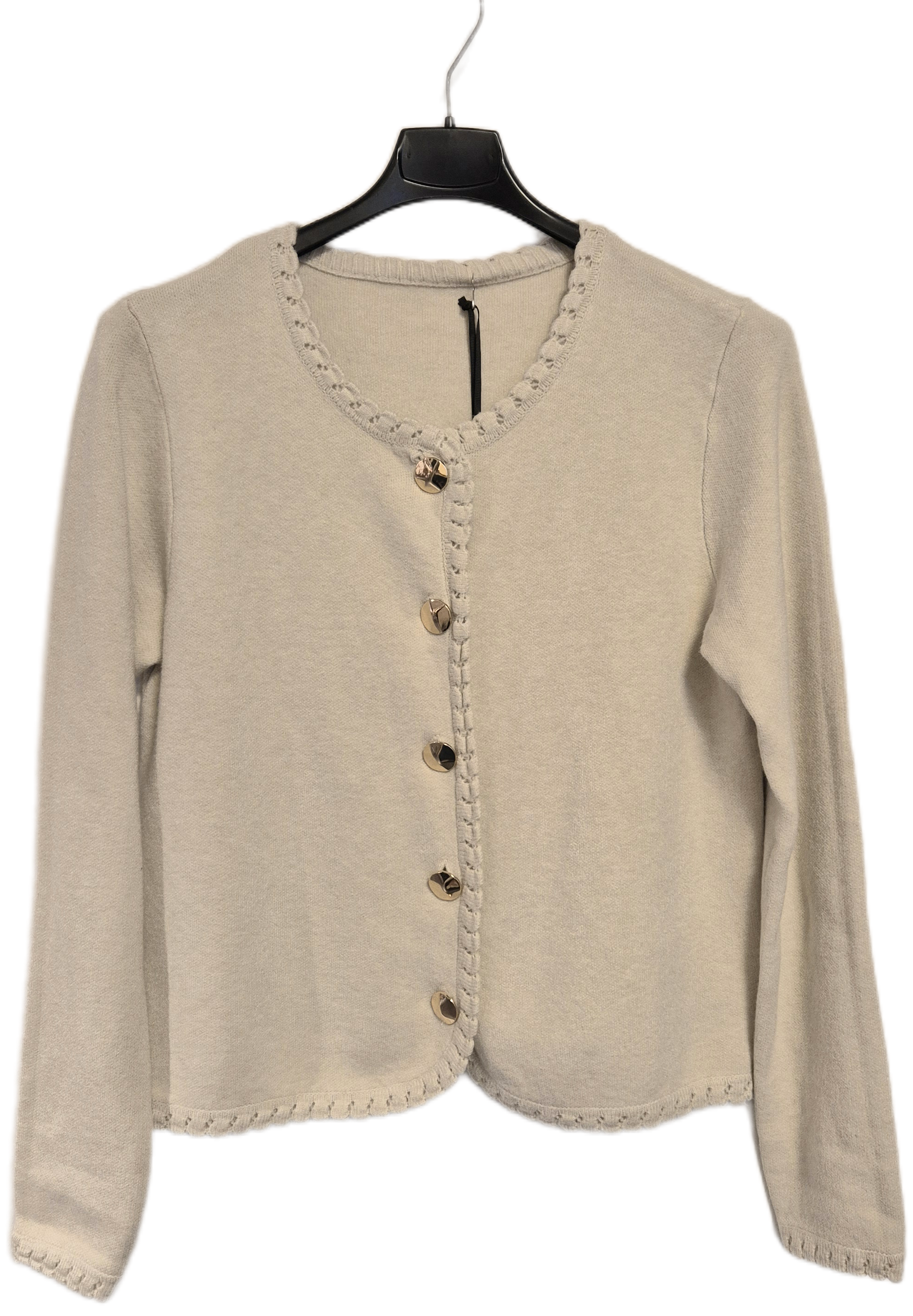 Prachtig fijngebreid vestje met een ronde hals. Langs de halslijn en op de borstzakjes zit een randje zilverkleurige pailletten. Het vestje sluit door middel van een sierlijke, zilverkleurige knopen. Draag het…