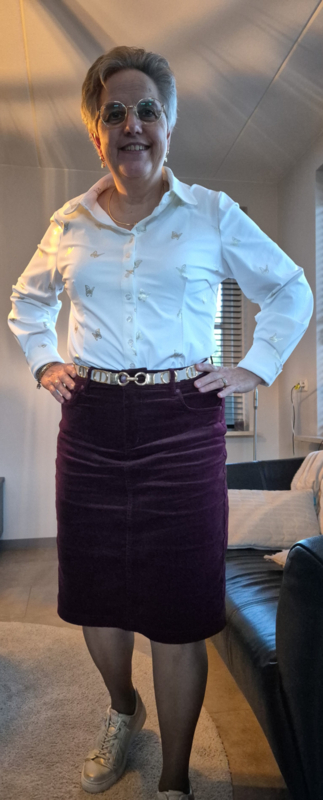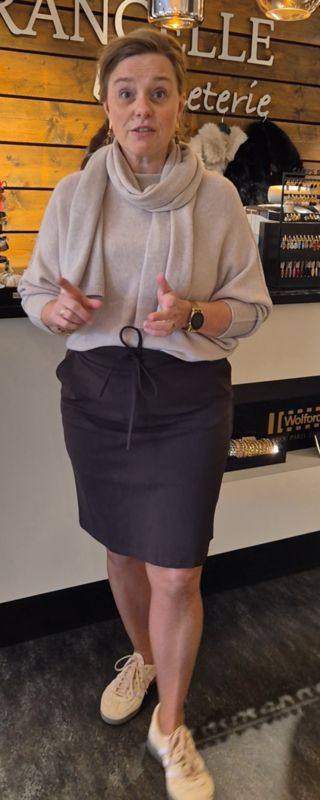 Een nieuw model in de collectie van Triple Nine. Geïnspireerd door de bestseller de Sweetheart blouse van vorig seizoen. Deze doorknoopblouse heeft een kraag en lange lichtpoffende mouwen. De travelstof is…€ 69,95 - TRIPLE NINE rok art. RK7301 - donkerbruin
